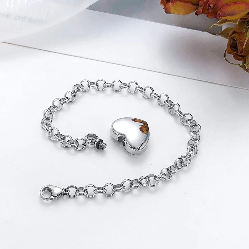 Esta elegante pulsera de acero inoxidable está diseñada como una urna en forma de corazón para cenizas.